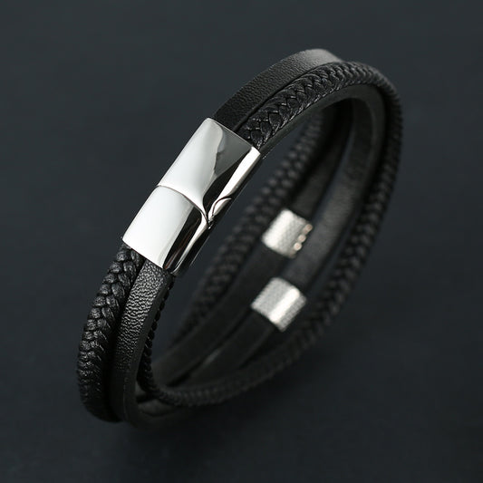 Vintage Stainless Steel Braided Black Leather Bracelet