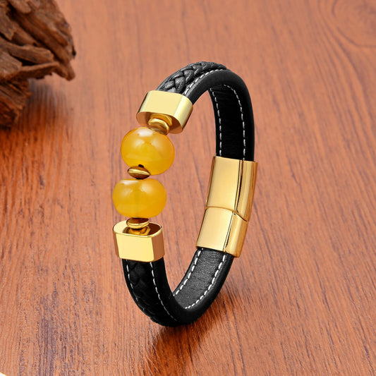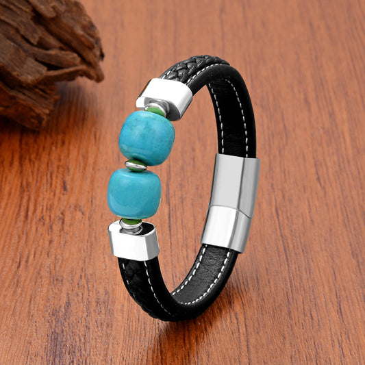 Stone Beaded Stainless Steel Buckle Leather Bracelet