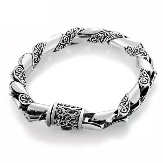 Handmade Vintage Punk High Polished Auspicious Flowers Embossed Silver Bracelet