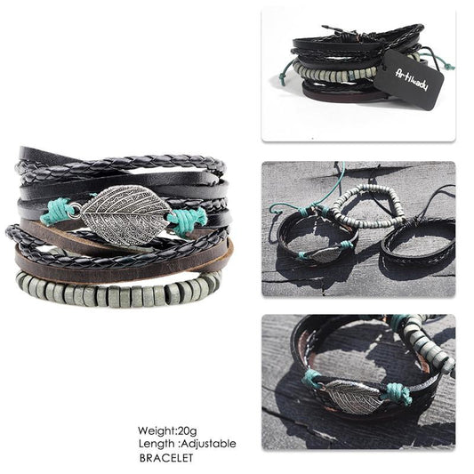 6pcs Black Wristband Genuine Leather Bracelet Set