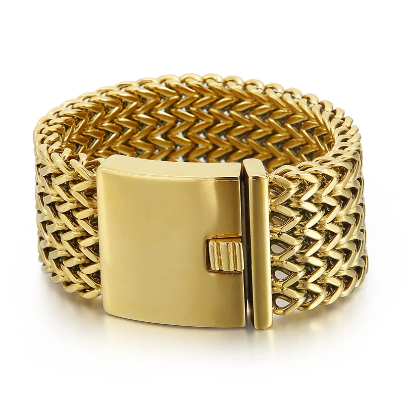 Upgrade your accessory game with our Mesh Polished Link Chain Bracelet. Choose from 12/18/30mm chain options for a personalized fit. The polished Dubai gold will add a touch of cool to any outfit, making it the perfect accessory or gift for any fashion-forward man. Make a statement with this must-have bracelet. Elevate your style with our Mesh Polished Link Chain Bracelet, available in 12/18/30mm chain options for a custom fit. The polished Dubai gold adds a luxurious touch to any outfit, making it a standout accessory or gift for men who love to make a statement. Don't miss out on this must-have addition to your wardrobe!